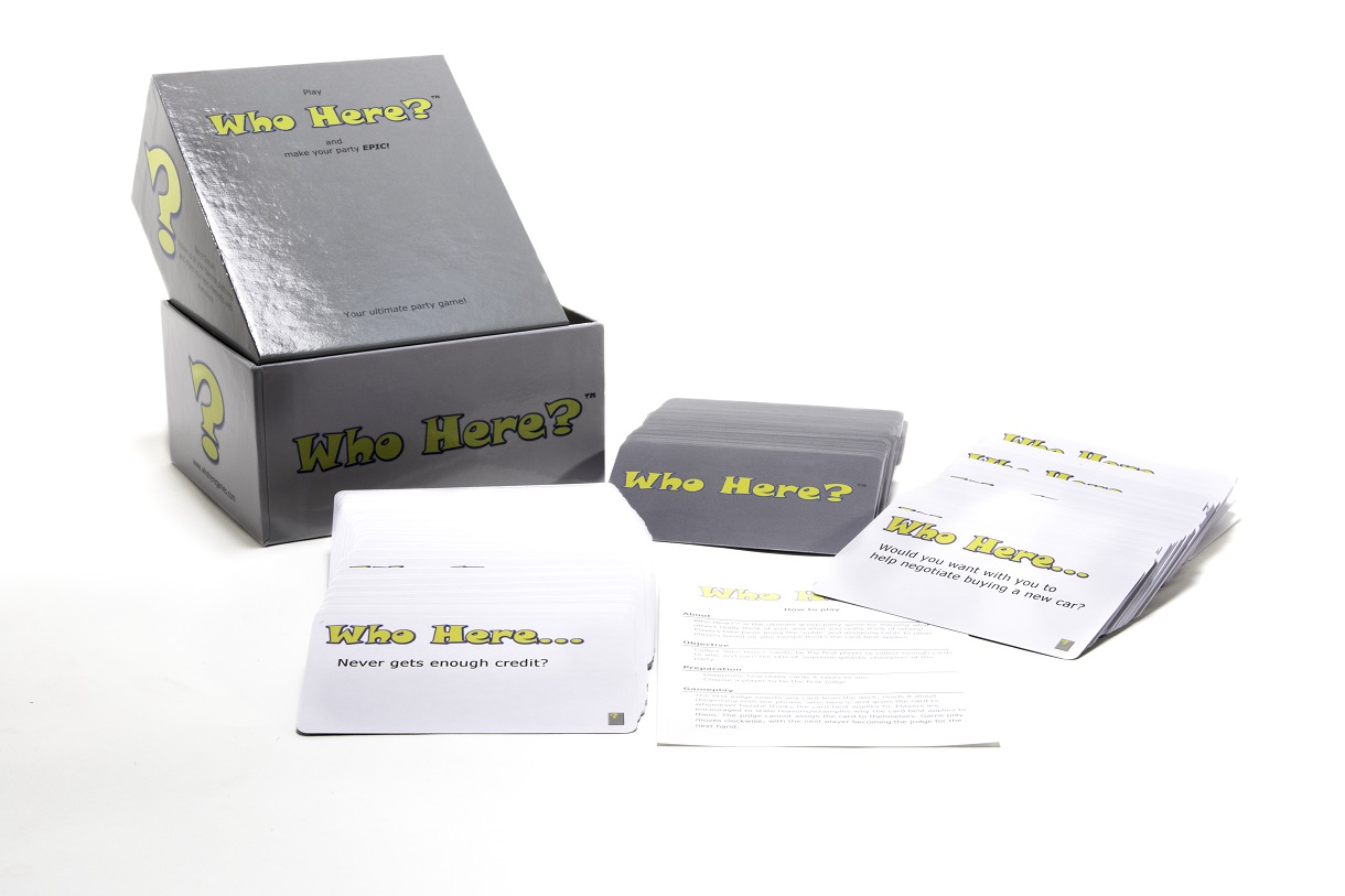Who Here?™ is your ultimate party game for as many players as you have partiers (the more the better!). Included are 330 games cards describing interesting, whimsical, or revealing characteristics or scenarios that you match to the most applicable or deserving player. The first player to earn the target number of cards wins! Players want to earn cards, and can influence the judge with the best explanation why they match the card.